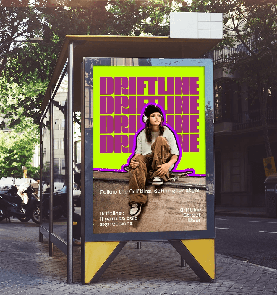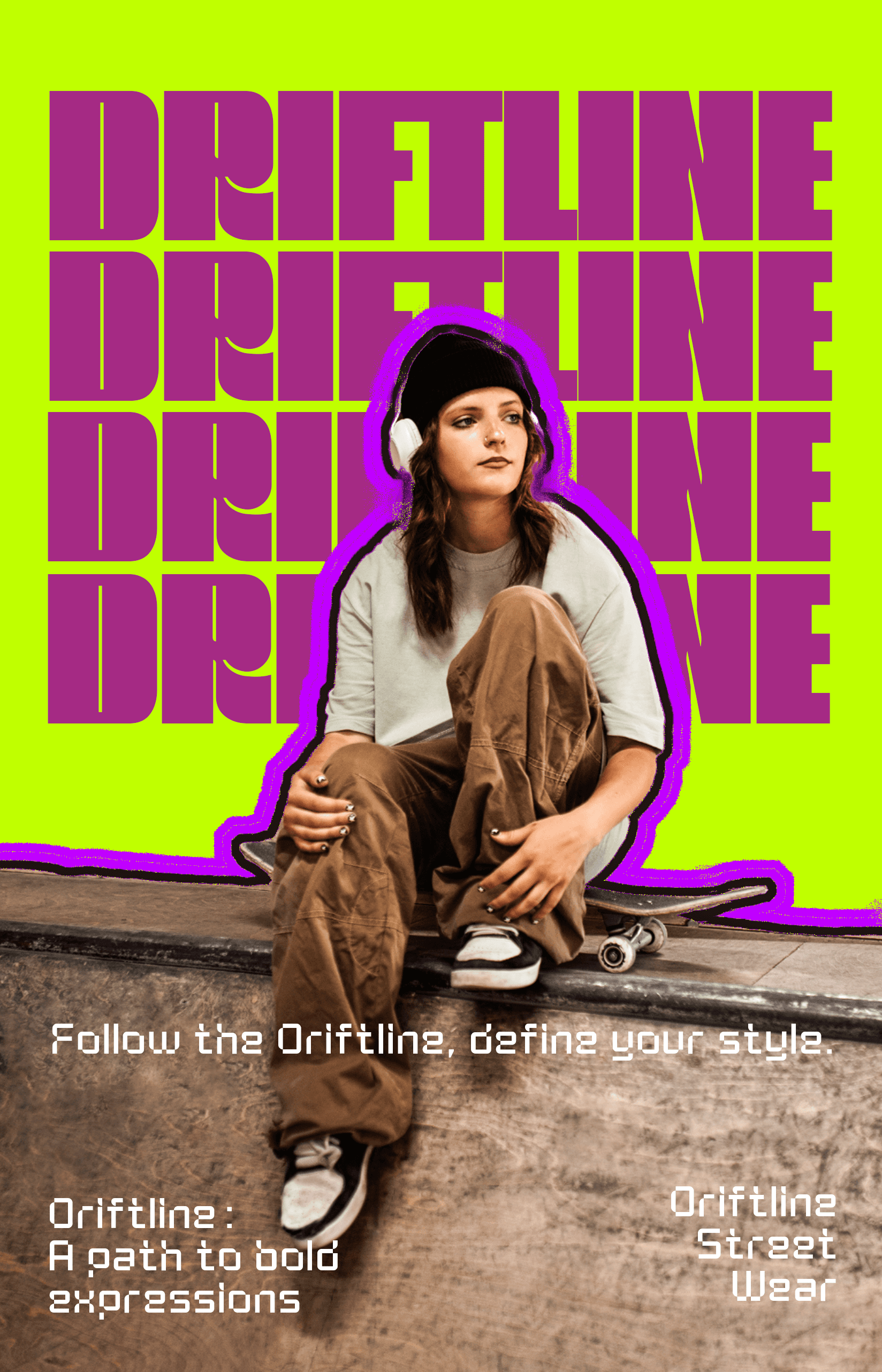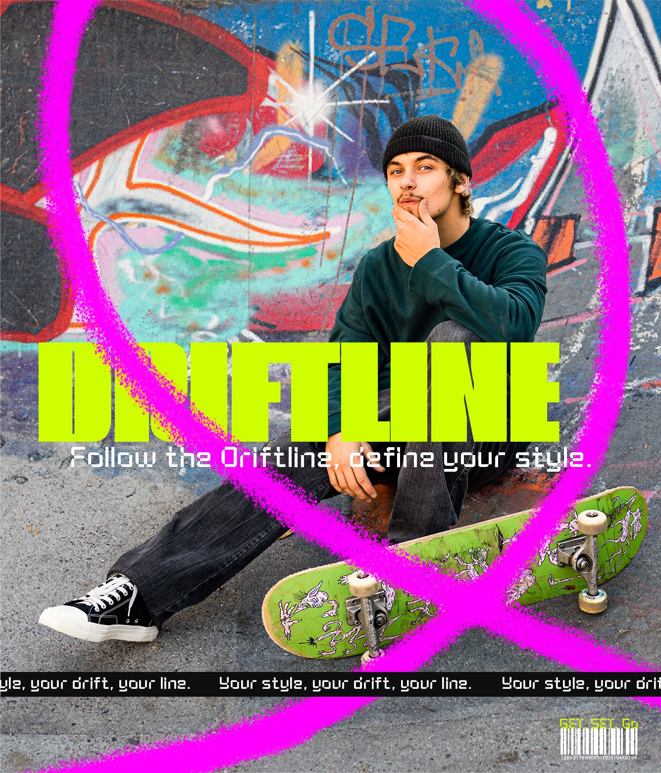We leaned into visual dissonance — jarring neon contrasts, barcode motifs, graffiti-style strokes and oversized typography. Inspired by skate culture, music, and 90s zines, we crafted a design language that’s both chaotic and controlled. The name Driftline became the concept itself: a metaphor for going against the grain, carving your own route through personal style.