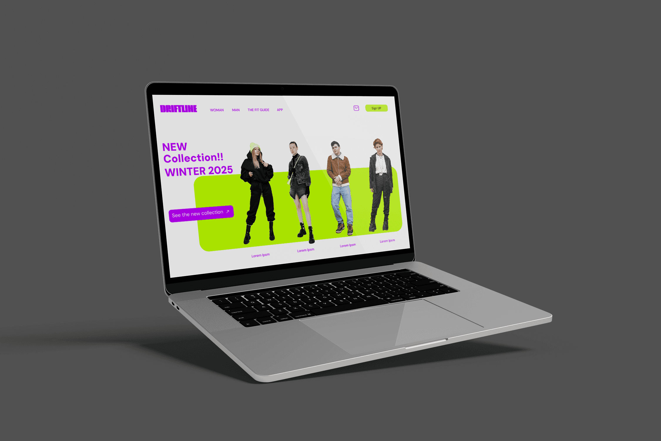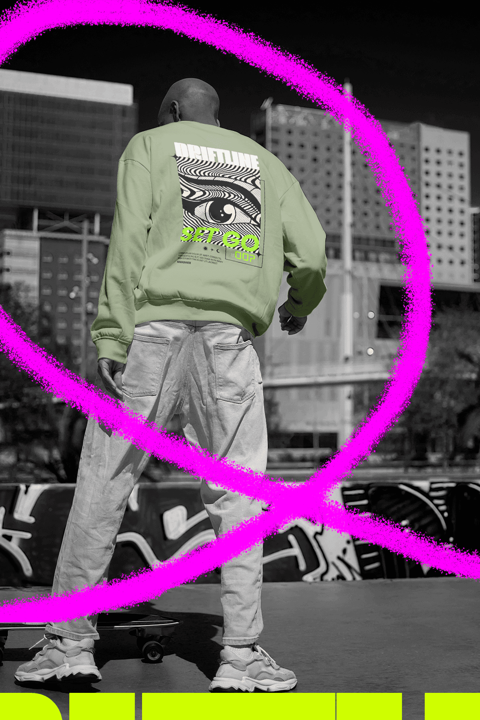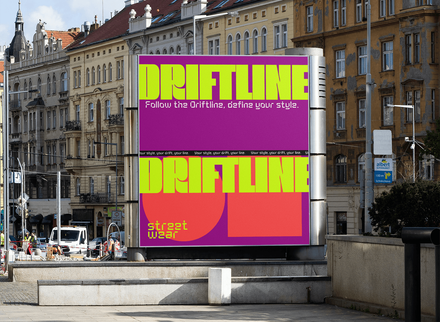 We leaned into visual dissonance — jarring neon contrasts, barcode motifs, graffiti-style strokes and oversized typography. Inspired by skate culture, music, and 90s zines, we crafted a design language that’s both chaotic and controlled. The name Driftline became the concept itself: a metaphor for going against the grain, carving your own route through personal style.